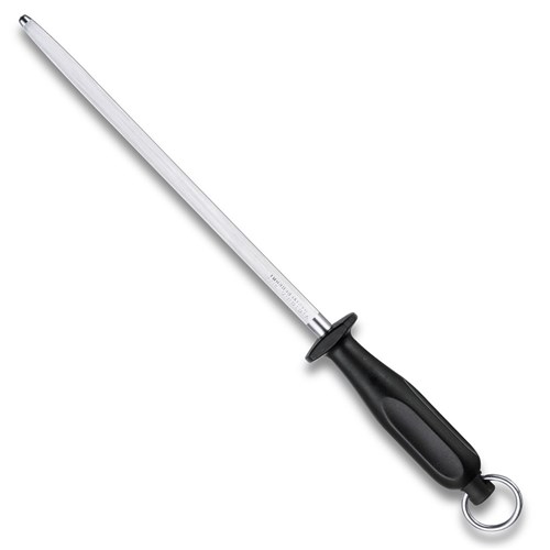 This 25cm Sharpening steel measures 11cm in diameter. It's hard chromium plated surface leaves a fine sharp, finish on all straight cut knives