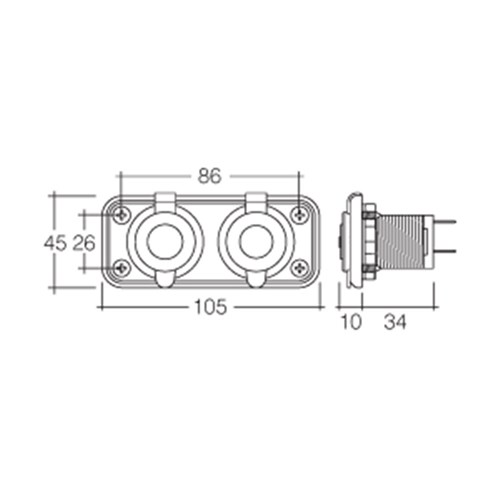 Features dustproof covers and heavy-duty construction. The fitting mechanism allows installation into interior or exterior panels including steel and aluminium. Amperage rating: Accessory Socket 20A at 12V, 10A at 24V. Merit Socket 16A at 12V, 8A at 24V. Mounting opening 29mm dia. per socket.