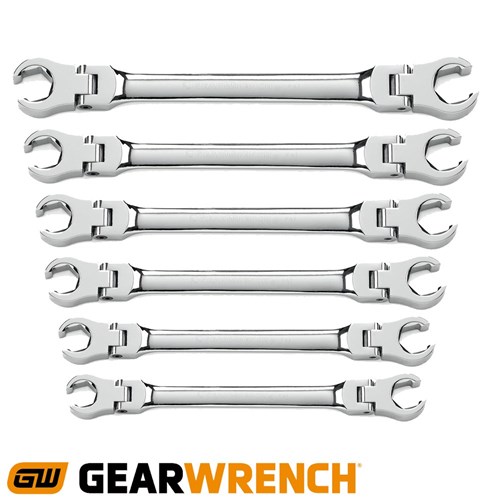 This GearWrench 6 piece Metric Flex Flare Nut Wrench Set comes with 9 x 11mm, 10 x 12mm, 13 x 14mm, 15 x 17mm, 16 x 18mm and 19 x 21mm flex flare nut wrenches, fully polished with a long pattern for greater leverage and flex head wrench ends for increased access around obstructions. Sizes are indicated by stamps on both sides of the wrench for greater visibility.