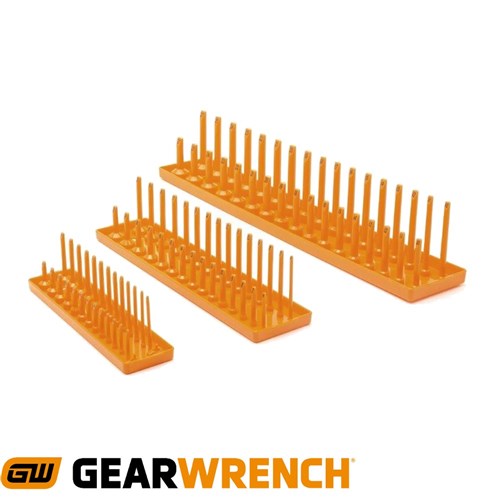 The Metric Socket Rack Sets serve the needs of professional automotive or industrial mechanics with clearly labelled pins to hold 90 total sockets in convenientvertical storage. These sets include three racks designed for 1/4", 3/8", and 1/2" drive sizes, which hold 26, 30, and 34 sockets total, respectively. Fit standard or deep sockets down over the pins, and use the size markers printed on each pin's top to find the right socket for any fastener. These sturdy, break resistant pins help you organize and access your sockets in fast-paced professional environments.