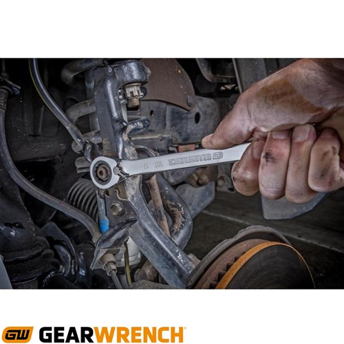The GEARWRENCH 22mm 90-Tooth 12 Point Reversible Ratcheting Wrench is a high-performance tool built to tackle tough jobs in confined spaces. With a 90-tooth gear and a compact 4° swing arc, this wrench allows you to turn fasteners with minimal movement, even in the tightest spots. The low-profile reverse lever provides quick switching between forward and reverse without removing the wrench, offering smooth operation. Its 15° offset box end improves clearance, reducing the potential for injury, while off-corner loading on both the open and closed ends ensures a secure grip and reduces fastener rounding. The high-visibility ink size markings make size identification a breeze, and the full-polish chrome finish is resistant to corrosion, easy to clean, and built for long-lasting durability. Exceeding ASME and ANSI specifications, this wrench is backed by the trusted GEARWRENCH Full Lifetime Warranty for dependable, lasting performance.