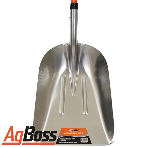A strong aluminium grain shovel with a fibreglass D-handle. This shovel is built tough and is useful for grain, landscapers and most other applications.