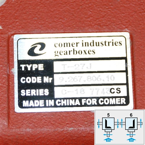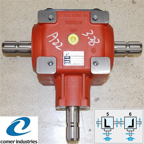 Comer T-27 Gearbox for general applications. Commonly used in agricultural applications where 1-3/8" Z6 Spline input shafts are required. This Comer gearbox is chinese origin of manufacture. Common uses include auger bins. Using tapered roller bearing internals the box uses SAE90 gear oil. It is supplied without oil.