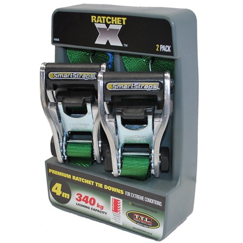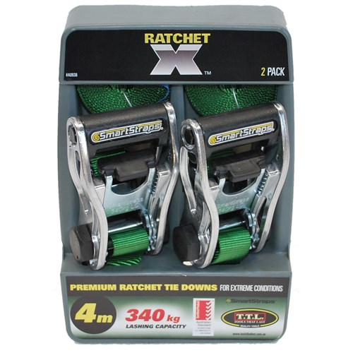 Smart Strap RatchetX tie down strap. 25mm x 2.5m size twin pack with 340Kg lashing capacity. Features super-strong webbing and a nice padded grip for ease of use.Conforms to Australian Standards.