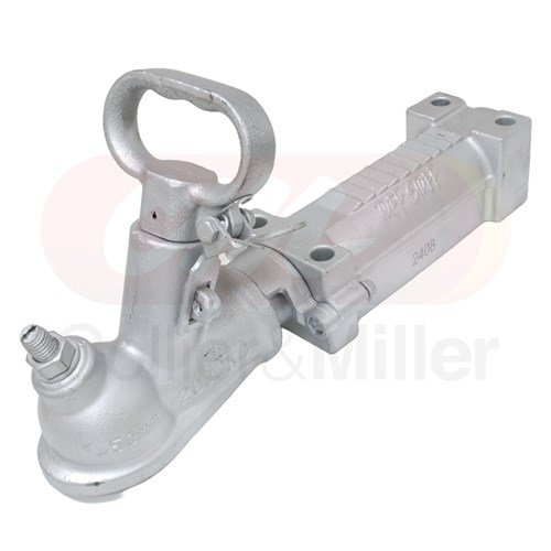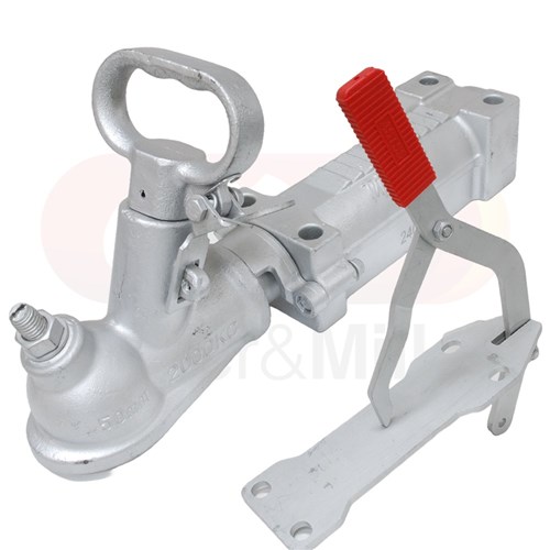 Mechanical overide 4 hole trailer coupling to fit 50mm tow ball. Rates to 2000Kg this trailer coupling is designed for use where brake actuation is done using mechanical brakes connected with cable. Supplied with actation lever ans hand brake.