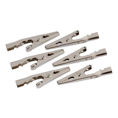 Blister pack of 6 nickel plated alligator clips. Jaws open to 8mm.