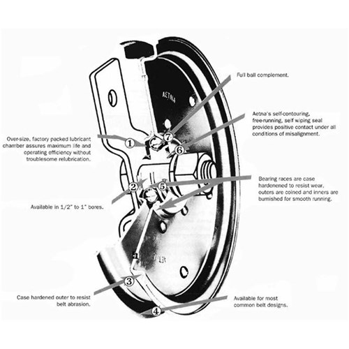 Aetna Flanged Belt Idler. Generally used as tighteners or direction changers. Permanently lubricated and sealed against grime and dirt. Fit into existing design with little or no engineering changes, or readily adapted to new designs.