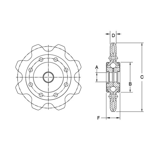 This heavy duty idler sprocketis designed to suit CA550 chain. Features 8 teeth with abearing diameter size to suit a 5/8" bolt. We find this idler is commonly used in somecorn front chain applications.
