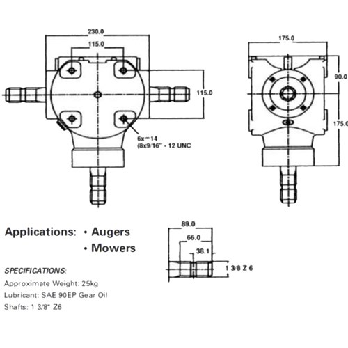 Sturdy SG iron housing gearbox for general applications. Commonly used in agricultural applications such as auger bins , augers and mowers where 1-3/8" Z6 Spline shafts are required. This gearbox is chinese origin of manufacture.