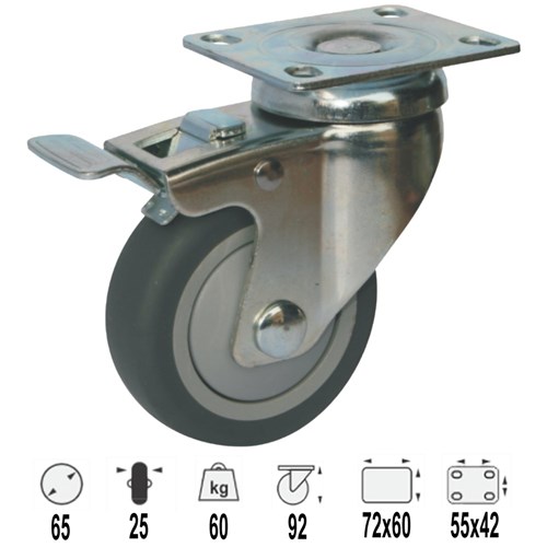 Light Duty castor suitable for loads up to 60kg. This castor is a zinc plated unit and features a ball bearing mounted Rubber wheel that is hard wearing and has non-marking properties. This is a swivel castor that is fitted with the 'Total Brake' option.