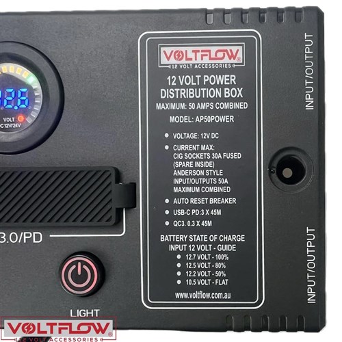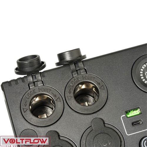 VoltFlow's 12 Volt Multi-Function Power Extension Box distributes up to 50 amps of power from your auxiliary battery or battery box to multiple 12V sockets, providing uninterrupted power for devices such as phones, tablets, ovens, 12V fridges, spotlights, and more.