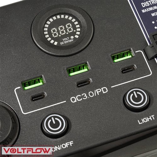 VoltFlow's 12V Power Box features a built-in LED, easy-to-read, multi-coloured voltmeter that allows for real-time battery voltage monitoring.