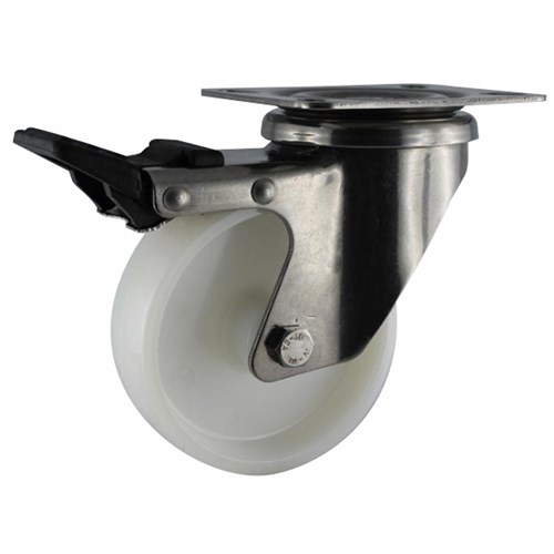 This 100mm braked swivel castor combines hygienic performance with secure, corrosion-resistant mobility. Featuring a durable white nylon wheel and stainless-steel swivel bracket with an integrated brake, it’s designed for environments where both cleanliness and stability are critical. The wheel complies with hygiene regulations, making it ideal for food processing and other sanitary applications. The stainless-steel plain bush ensures smooth, maintenance-free operation, while the reliable brake locks both the wheel and swivel for added safety and control.