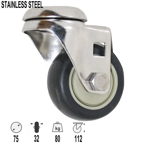 Stainless Steel castor suitable for loads up to 80kg. This castor is a stainless steel unit and features a bearing mounted Rubber wheel that is hard wearing and has non-marking properties. This is a swivel castor.