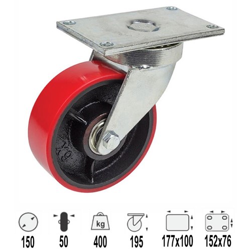 Industrial Waste Bin castor suitable for loads up to 400kg. This castor is a zinc plated unit and features a ball bearing mounted Urethane wheel that is hard wearing and has non-marking properties. This is a swivel castor.