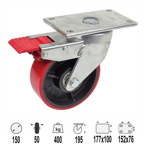 Industrial Waste Bin castor suitable for loads up to 400kg. This castor is a zinc plated unit and features a ball bearing mounted Urethane wheel that is hard wearing and has non-marking properties. This is a swivel castor that is fitted with the 'Total Brake' option.