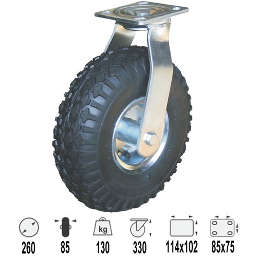 Pneumatic castor suitable for loads up to 130kg. This castor is a zinc plated unit and features a ball bearing mounted Pneumatic wheel that is hard wearing and has non-marking properties. This is a swivel castor.