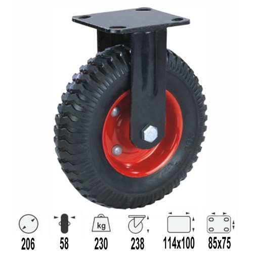 Puncture Proof castor suitable for loads up to 230kg. This castor is a zinc plated unit and features a ball bearing mounted Solid Rubber wheel that is hard wearing and has non-marking properties. This is a fixed castor.