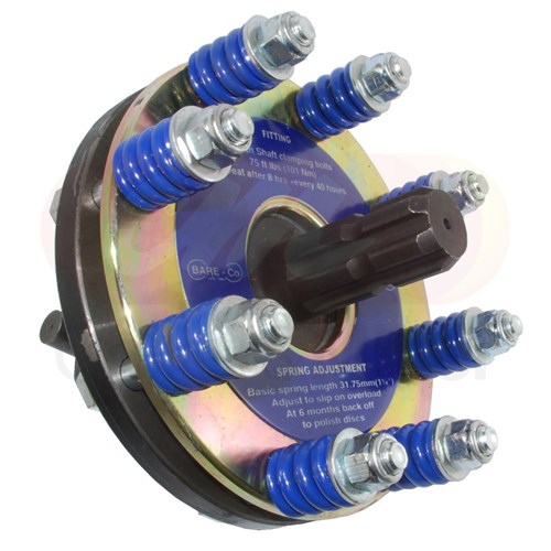 Bare Co. blue-torque heavy-duty, high-capacity friction type safety clutch. The design of the blue-torque clutch offers increased power transmission in a smaller diameter clutch. Ideal for use in agricultural applications including slashers, chaser-bins and other PTO powered machinery.