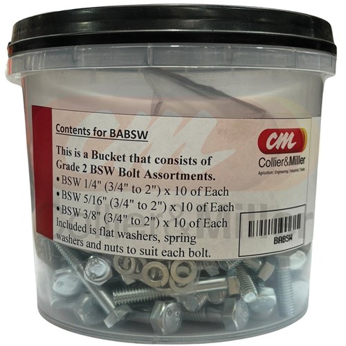This is a bolt assortment that consists of Grade 2 BSW threaded mild steel bolts, nuts, flat washers and spring washers.