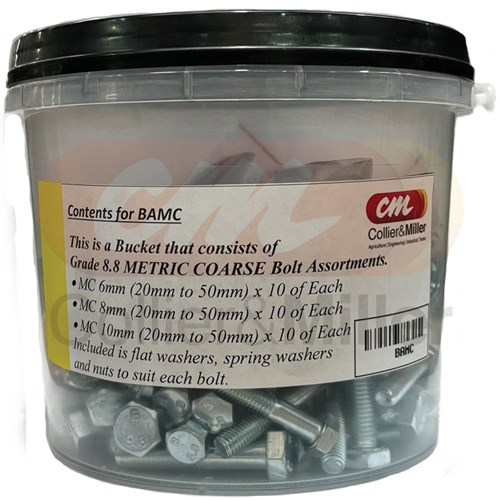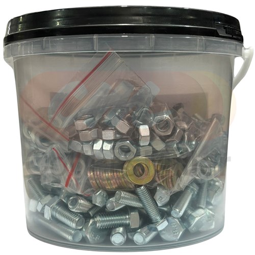 This is a bolt assortment that consists of Class 8.8 Metric Course threaded high tensile bolts, nuts, flat washers and spring washers.