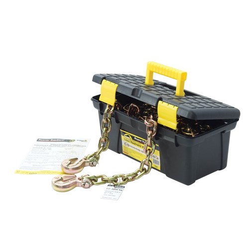 Beaver Grade 70 Lashing Chain Assembly. Made from transport grade 70 high tensile this setis widely used for lashing loads. Features 8mm chain x 9mlong with 2 x grab hooks. Packed in plastic toolbox.