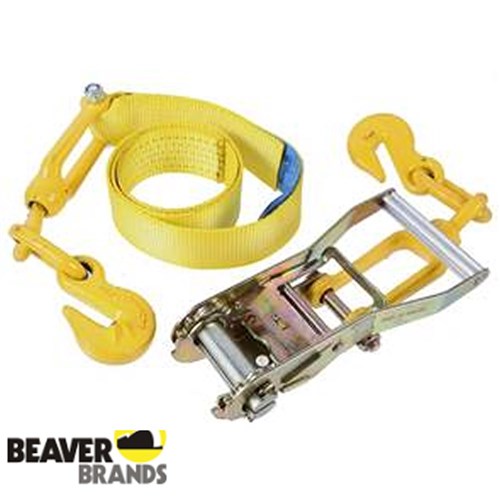 Beaver Grade 70 Web-Dog. A convenient way to replace traditional chain load binders. Rated at 3800KG capacity (for lashing purposesonly) this comes with 1m of 50mm Heavy duty webbing, 50mm ratchet and 2 x 8mm swivel grab hooks.