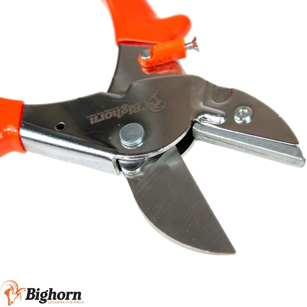 The Bighorn Anvil Secateur is a reliable, value-priced tool designed for tough pruning tasks. Its straight blade anvil design ensures efficient cutting by applying the proven principle of a drawing cut against a fixed base plate. Ideal for hard woods like citrus and almond trees, it offers superior cutting power transmission. Built for durability, the upper blade is made from high-carbon SK-5 steel with a hard chrome plating, while the lower anvil is crafted from aluminium. With high-visibility orange handles and an ergonomic design, this 205 mm secateur delivers precision with a cutting capacity of 20 mm.
