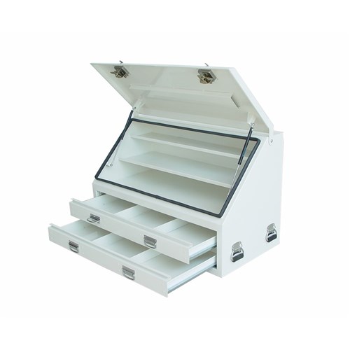 Fully welded heavy duty steel boxes, which are ideal for travellingtradespersons. T Handles locks for security with back up sliding steelrod to secure drawers when travelling. Powder coated ripple white finishwith full weather seal around lid for protection from the elements. It isrecommended that power tools be kept in water tight containers insidethe unit for extra protection.