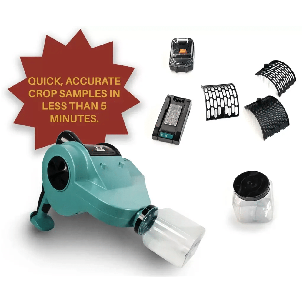 The MiniCombine™ is powered by a rechargable Lithium-ion battery, and has a variable speed brushless motor. It comes with 4 interchangable concaves for many different crops and gives you a clean sample every time (No tools required to change).