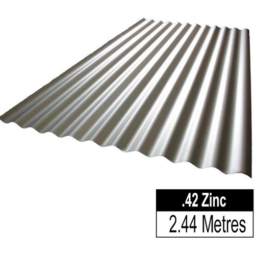 Australian Made Zincalume corrugated cladding. Thickness of .42mm is suitable for roof or walls. Pre-cut length of 7' (2440mm) with a cover width of 762mm. Features; Easy Fixing - conventional through fixed screws maximise performance and installation, Hi-tensile Steel-light weight and high strength, 5 Degree Minimum Pitch - to suit most traditional applications. Anti-capillary Side Laps - 11/2 rib overlaps for weather protection.
