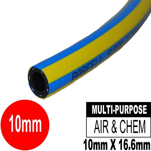 Barfell Super Ultraflex is a Premium lightweight flexible Cgeneral purpose air and water hem-Air hose. The added benefihose with highly distinctive t of a chemical resistant tubeyellow & blue stripes. makes it suitable for low preProviding optimum flexibility ssure agricultural spray appliwith good resistance to wear cations. Conforms to AS/NZS 25and kinking. 54 class B requirements. Excel lent cold weather flexibility Suitable for general purpose with high visibility blue coveair & water supply. Exceeds r.ID 10mm x OD 17mm. AvailableAS/NZ2554 Class B. in 70m roll only. Choose CAC0