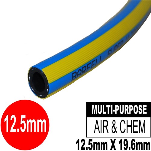 Barfell Super Ultraflex is a Premium lightweight flexible Cgeneral purpose air and water hem-Air hose. The added benefihose with highly distinctive t of a chemical resistant tubeyellow & blue stripes. makes it suitable for low preProviding optimum flexibility ssure agricultural spray appliwith good resistance to wear cations. Conforms to AS/NZS 25and kinking. 54 class B requirements. Excel lent cold weather flexibility Suitable for general purpose with high visibility blue coveair & water supply. Exceeds r.ID 12.5mm x OD 19mm. AvailabAS/NZ2554 Class B. le in 50m roll only. Use PN CA