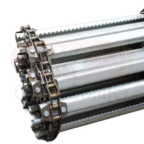 This complete chain assembly is supplied as CA512 (also known as CA624) with connectors and half links for each strand. We supply these chains in Australia from premium Drives USA made chain and grade 350 electroplated roll-serrated 6mm U-Bar slats. We guarantee the quality of these unit, however we recommend you fit new sprockets at the time of installation.