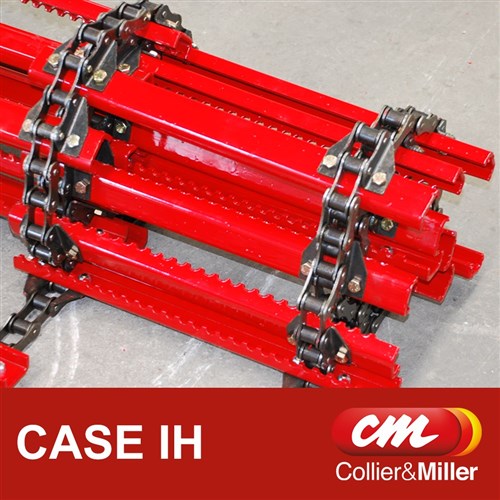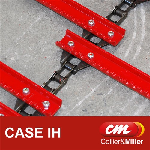 C&M replacement complete feeder house chain assembly to suit the front feeder house on Case-IH 130 & some early model 140 series combine harvesters. This is a set of three (3) replacement chains fitted with grade 350 electroplated 6mm roll-serrated U-Bar slats with the same spacing as the case original chain.