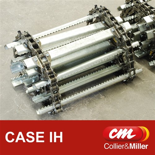 C&M replacement complete feeder house chain assembly to suit the front feeder house on CASE-IH 10 Series combine harvesters. This is a set of 2 x 2 chains fiited with electroplated 6mm serrated U-Bar slats with the same spacing as the CNH original chain.