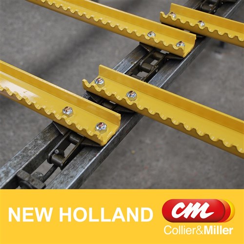 This is a replacement chain set supplied so you can re-use your existing slats. The attachment hole spacing is the same as the original NEW HOLLAND chain so the existing slats/bars will bolt straight on. This set uses thepremium quality TIMKEN-DRIVES USA chain. This set does not include the bolts or nuts.
