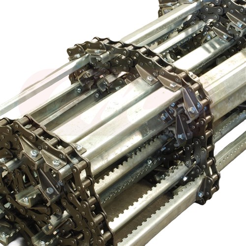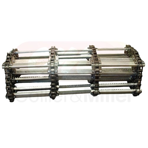 C&M complete feeder house chain to suit the front feeder house on New Holland combine harvesters ( with dynamic feed roll fitted). This is a set of four (4) replacement chains fiited with G350 electroplated 6mm roll-serrated u-bar slats with the same spacing as the New Holland® original chain.