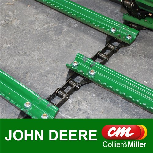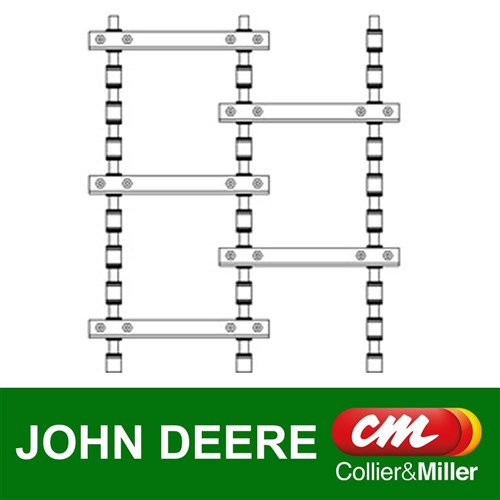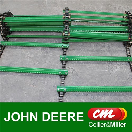 C&M replacement feeder house chain assembly to suit the front feeder house on John Deere combine harvesters.This is a set of three (3) replacement chains with zinc plated grade 350 serrated u-bars supplied as the same spacing and attachment holes as the John Deere original chain. This assembly has wider slat spacing, reducing the number of bars from 30 (OEM is 28 bars) to 22.