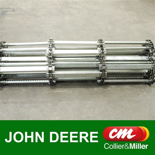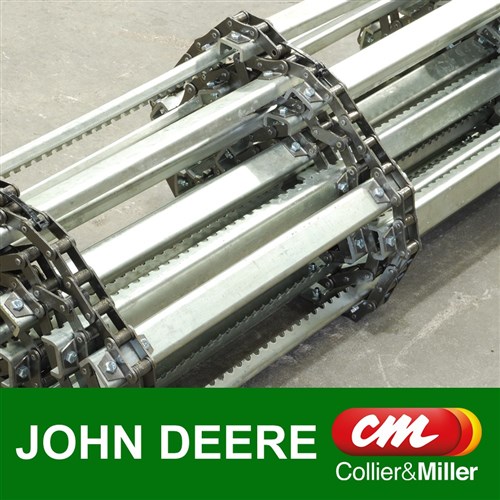 C&M replacement complete feeder house chain assembly to suit the front feeder house on 9600 & 9610 SERIES John Deere combines harvesters.This is a set of four (4) replacement chains fitted with 6mm serrated U-Bar slats configured with 34 slats.