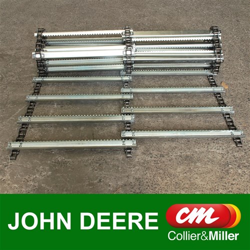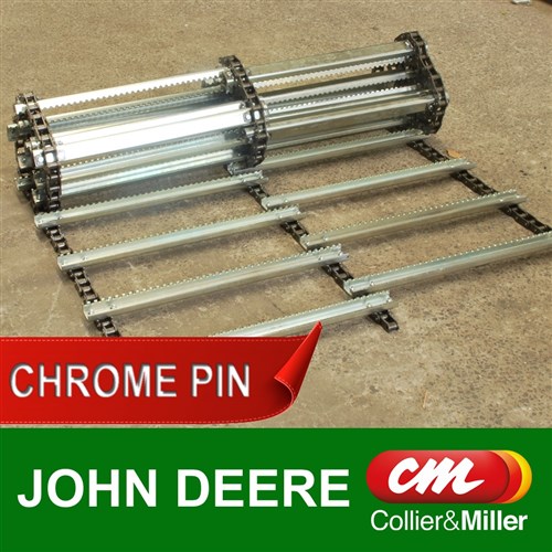 C&M replacement complete chrome-pin feeder house chain assembly to suit the front feeder house on John Deere combine harvesters.This is a set of three (3) replacement chains fitted with zinc plated 6mm serrated U-Bar slats with the same spacing as the John Deere original chain.
