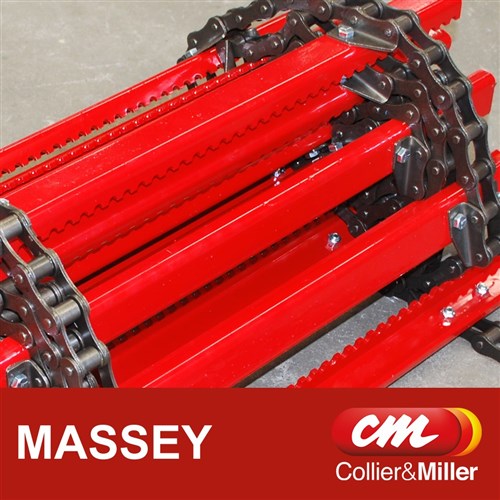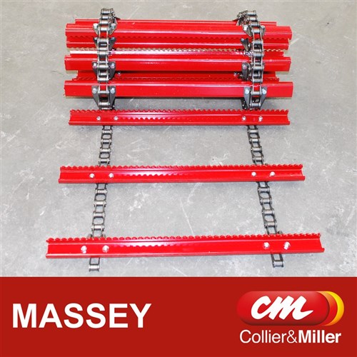 C&M replacement complete feeder house chain assembly to suit the front feeder house on Massey Ferguson 8780 combine harvesters.This is a set of two (2) replacement chains fitted with 6mm serrated U-Bar slats with the same spacing as the Massey original chain.