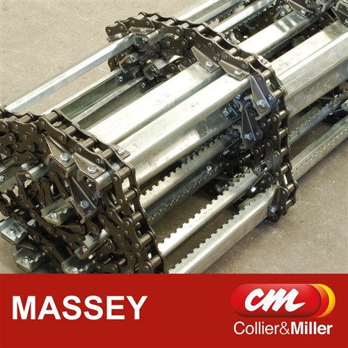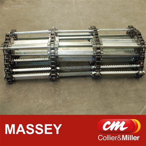 C&M replacement complete feeder house chain assembly to suit the front feeder house on Massey Ferguson combine harvester.This is a set of four (4) replacement chains fiited with electroplated grade 350 6mm serrated U-Bar slats with the same spacing as the original chain.