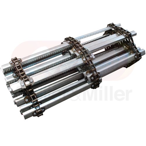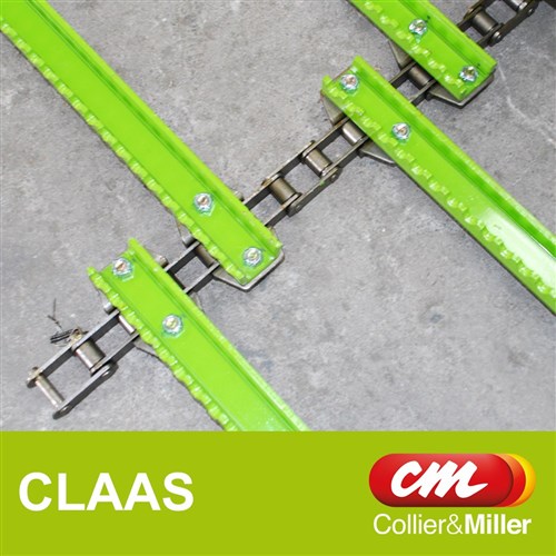 C&M replacement complete feeder house chain assembly to fit the front feeder house on selected CLAAS® combine harvesters. This is a set of three (3) replacement chains fiited with roll-serrated, electroplated 6mm U-Bar slats with the same spacing as the CLAAS® original chain.