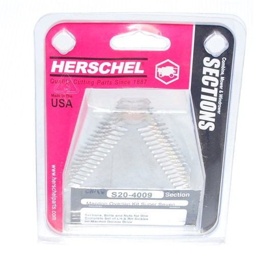 This knife overlap kit suit's a course knife with 2-1/8" hole spacings. The kit consists of 4 chrome plated top countersunk knife sections, 3 chrome plated bottom countersunk knife sections, and 13 countersunk bolt's with lock nuts. Each knife section has 7 teeth per inch.