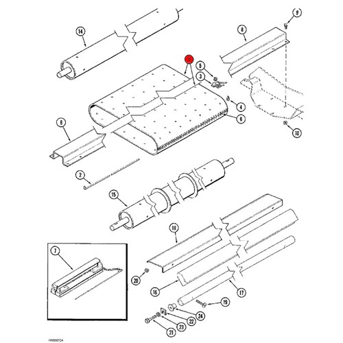 Aftermarket canola front conveyor belt assembly to suit CASE grain header model 1015 (S/N JJC0310000 & BEFORE) (01/87 - 12/98). This belt is supplied with no fingers, includes clip style belt joIner already fitted. Belt dimensions 21.75" Wide x 60.13" Long
