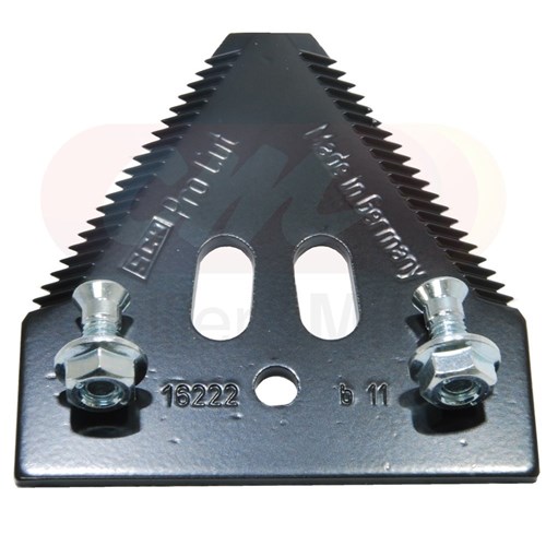 The sections are fastened to the knifeback with a special serrated bolt and a flange nut. The conically shaped and serrated body of the bolt locks tightly in the section and knifeback hole. A tight and secure connection is the result. At the same time, sections can be quickly changed.