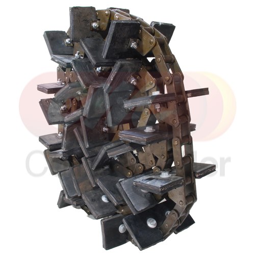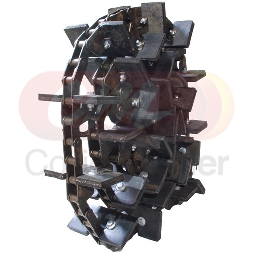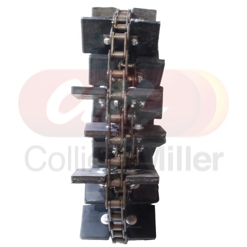 C&M replacement clean grain (main) chain assembly to suit the clean grain elevators on Claas® Dominator™ 6 & 8 series  and Mega™ 8 series combine harvesters. This is a complete chain assembly including paddles with the same spacing and attachment as the Claas® original chain. This chain assembly is supplied with connectors and half links ready to fit your existing paddles.