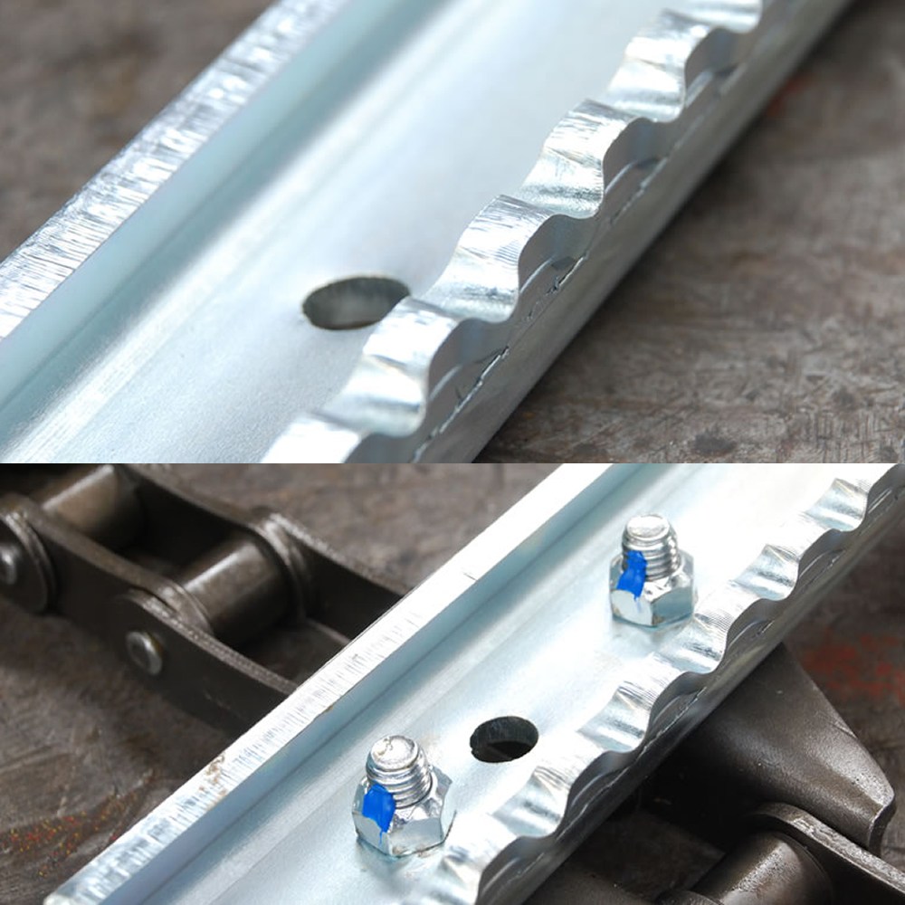 This complete chain assembly is supplied with connectors and half links for each strand. We supply these chains in Australia from premium grade black-pin chain and high performance roll-serrated 6mm U-Bar slats. We guarantee the quality of these unit, however we recommend you fit a new sprocket at the time of installation