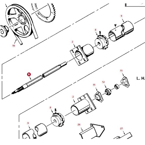 Aftermarket pivot shaft to fit AGCO Gleaner® front feeder chains on combine harvesters with 2.00" hex bore sprockets. This shaft is 2.00" hex to fit feeder house where 4 sprockets are used.